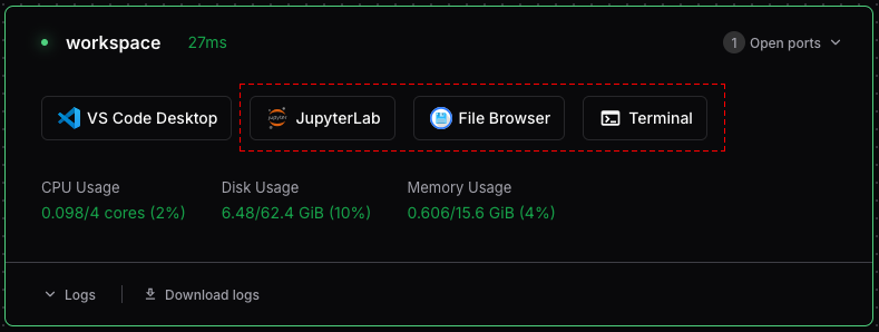 - Terminal: a browser-based terminal that provides instant access to your workspace’s shell environment.